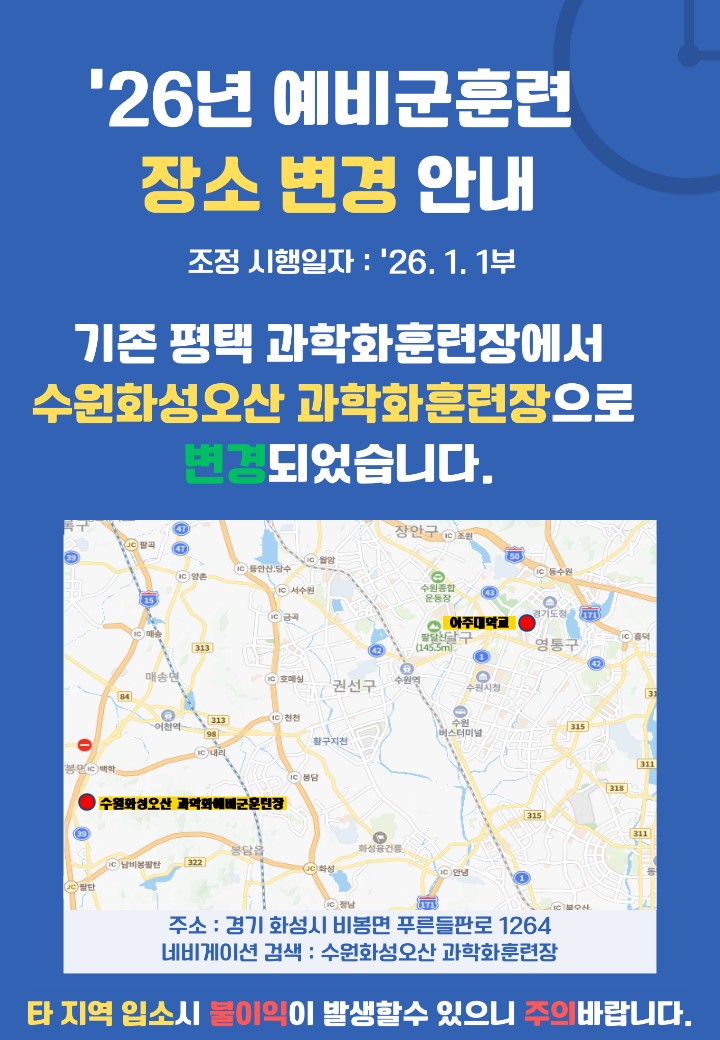 '26. 1. 1.부로 훈련장소가 기존 평택과학화훈련장에서 수원화성과학화훈련장으로 변경되었습니다.